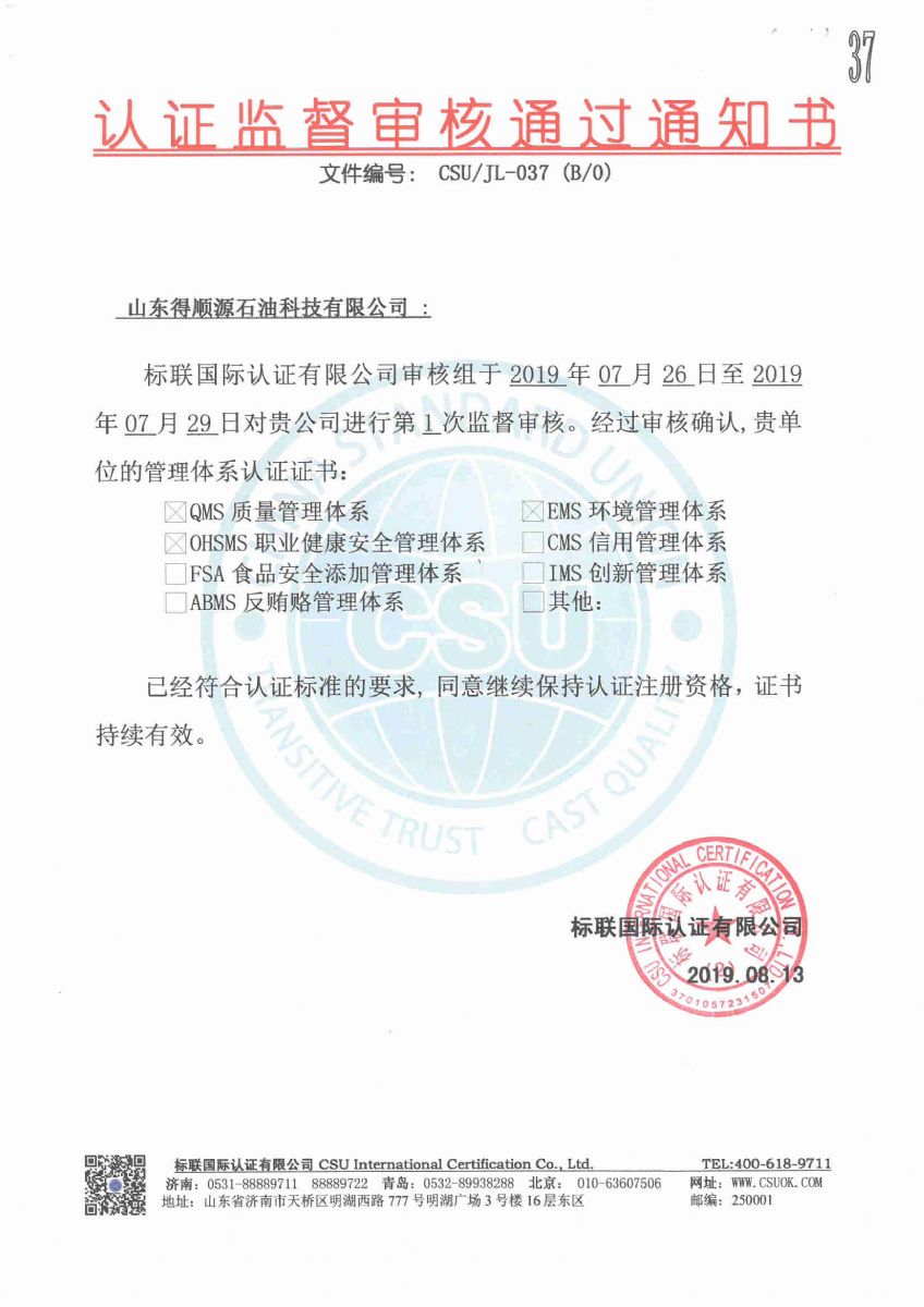 On August 19, 2019, the company is informed by China Standard International Certification Co., Ltd. that she has successfully passed the first supervision and audit of the certifications of quality management system, environmental management system and occupational health and safety management system with meeting requirements of certification standards. Thus the company will continue to maintain the certification registration qualification and the valid certificates.