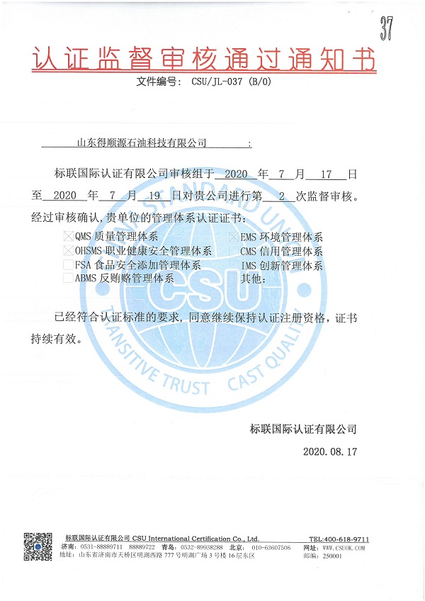 On August 19, 2020, the notice from CSU INTERNATIONAL CERTIFICATION CO., LTD., shows that Shandong Deshunyuan Petroleum Sci& Tech. Co., Ltd has successfully passed the second external supervision and audit of quality, environment and occupational health and safety management system certification. The management systems meet the requirements of standard, therefore the company will continue to maintain the certifications registration qualification, and the certificates continue to be valid as well.