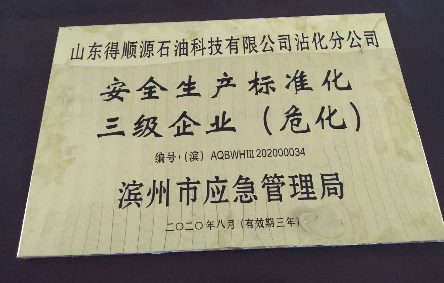 On October 13rd 2020, Shandong Deshunyuan Petroleum Technology Co., Ltd. Zhanhua Branch obtained the certificate of "Three-level Enterprise of Safety Production Standardization" issued by Binzhou Emergency Management Bureau.