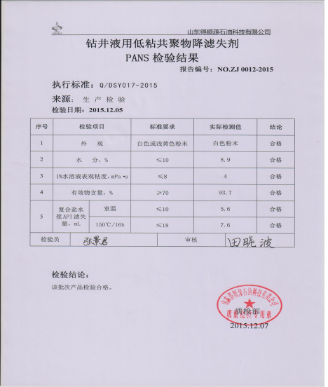 近日我公司歷經(jīng)兩年時(shí)間研發(fā)的新型鉆井液用降濾失劑——低粘共聚物降濾失劑PANS,先后在勝利、海南等多個(gè)油田現(xiàn)場(chǎng)應(yīng)用取得成功。該產(chǎn)品不僅解決了高溫高鹽條件下鉆井液濾失量的控制問(wèn)題,而且避免了對(duì)鉆井液流變性的影響,保持了鉆井液流變性的穩(wěn)定,受到現(xiàn)場(chǎng)鉆井液工程師的高度贊揚(yáng)。PANS是由AA、AMPS等為主要原材料,以水為溶劑,采用氧化還原引發(fā)體系,合成出的兩性耐溫耐鹽型聚合物降濾失劑。該產(chǎn)品不僅作用高效,而且具有很好的熱穩(wěn)定性,抗溫達(dá)160℃以上,抗鹽至飽和,與常用的LV-CMC、LV-PAC相比抗溫能力及降濾失效果大幅度提升,粘度效應(yīng)更低,應(yīng)用前景廣闊。