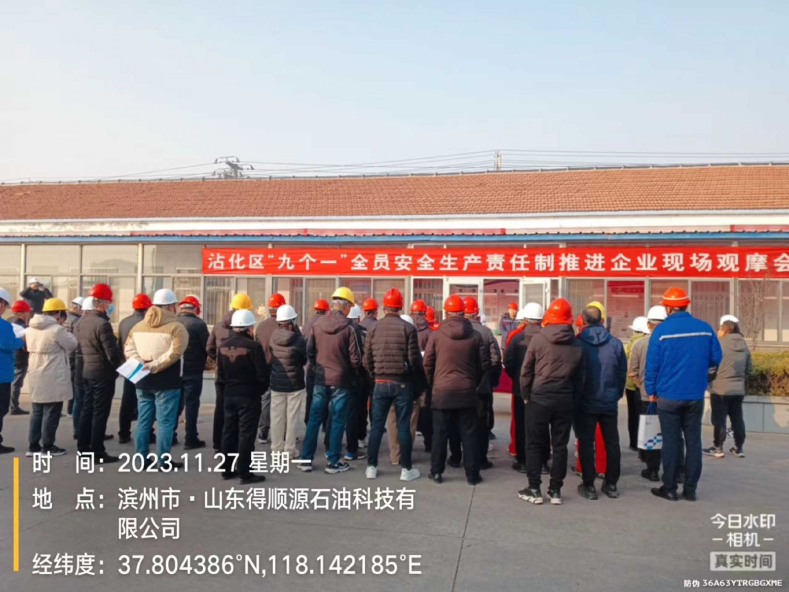 為進(jìn)一步鞏固“全員安全生產(chǎn)責(zé)任制推進(jìn)”工作,全面落實“濱州市九個一”規(guī)范化建設(shè)水平,2023年11月27日,全區(qū)“九個一、標(biāo)準(zhǔn)化試點提升”觀摩大會在我公司隆重舉行,本次活動由區(qū)應(yīng)急局組織,全區(qū)68家企業(yè)負(fù)責(zé)人及各鄉(xiāng)鎮(zhèn)、園區(qū)代表參加觀摩學(xué)習(xí)。