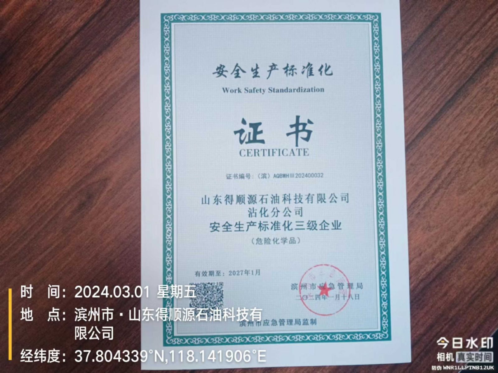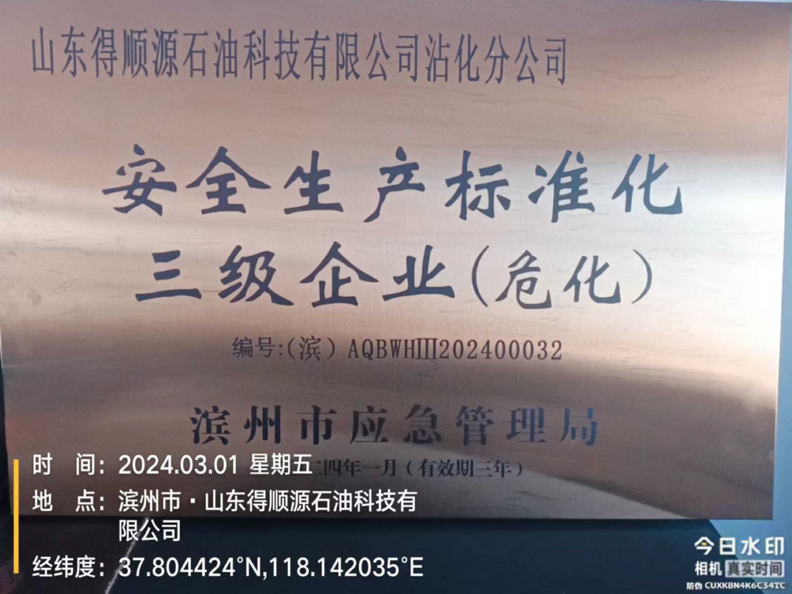 山東得順源石油科技有限公司沾化分公司順利通過(guò)濱州市應(yīng)急管理局組織的“安全生產(chǎn)標(biāo)準(zhǔn)化三級(jí)企業(yè)”換證復(fù)審。